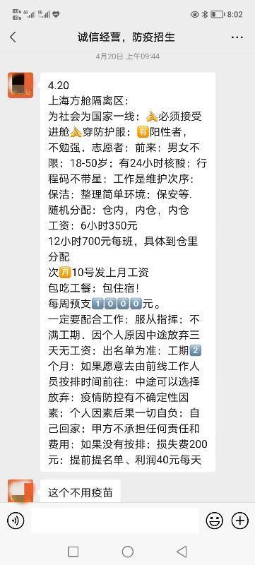2022年4月22日,上海市民包先生向上海奉贤公安分局江海派出所报案称,自己相信一个微信群中发布的招工信息,结果被骗了300元。包先生称当日其在一个微信群中看到一昵称为“诚信经营”的微信号在群内发布信息,称有渠道可以介绍人去方舱医院上班,包吃住不算,每天还能赚700元。包先生自己本是一名运输车的跟车工,因受疫情影响,本来就暂时停工,看到信息后心动不已,就与对方聊了起来。对方称需要收取接送费用。结果不仅打工无望,之后还联系不上对方,包先生才发现自己被骗。