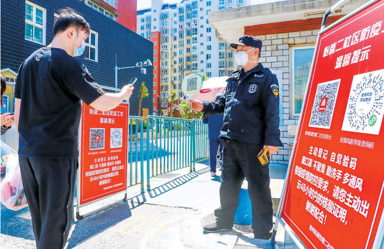 昨天,在顺义区胜利街道,小区门口加强扫码登记测温工作。